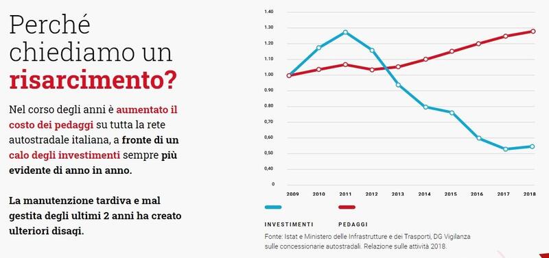 Il grafico, che viene mostrato sulla pagina dedicata, mostra infatti un calo degli investimenti dal 2011 ad oggi, ma un aumento costante invece dei costi del pedaggio.