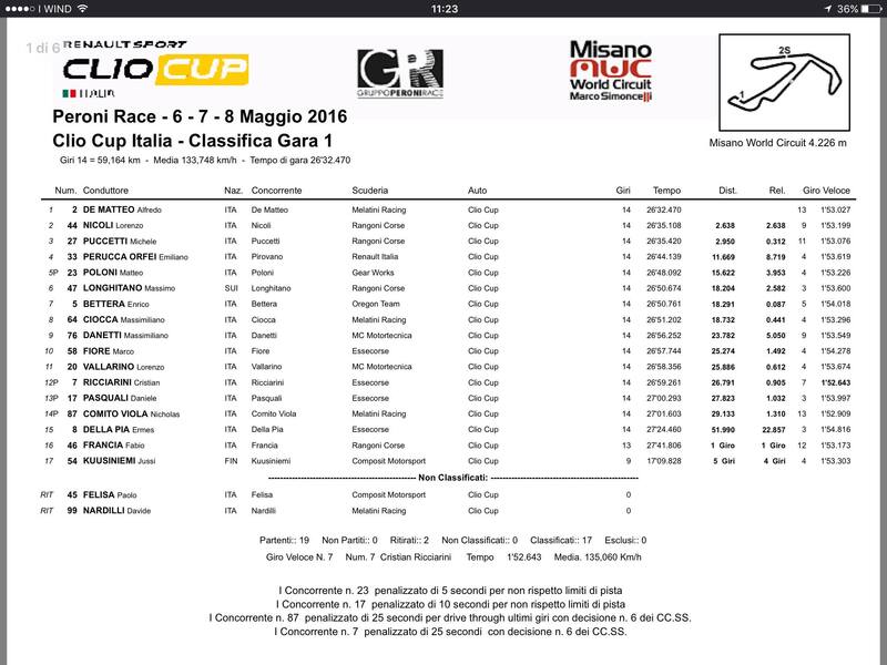 Un risultato già eccezionale, considerando com'era iniziata la corsa, impreziosito da alcune penalità inflitte dal direttore di corsa ad alcuni avversari...che mi hanno fatto balzare addirittura in quarta posizione! Incredibile davvero. Non me lo sarei mai aspettato di riuscire a chiudere la mia prima gara nella Clio Cup in una posizione così onorevole, ma evidentemente la fortuna ha voluto aiutarmi dopo una partenza così difficile.