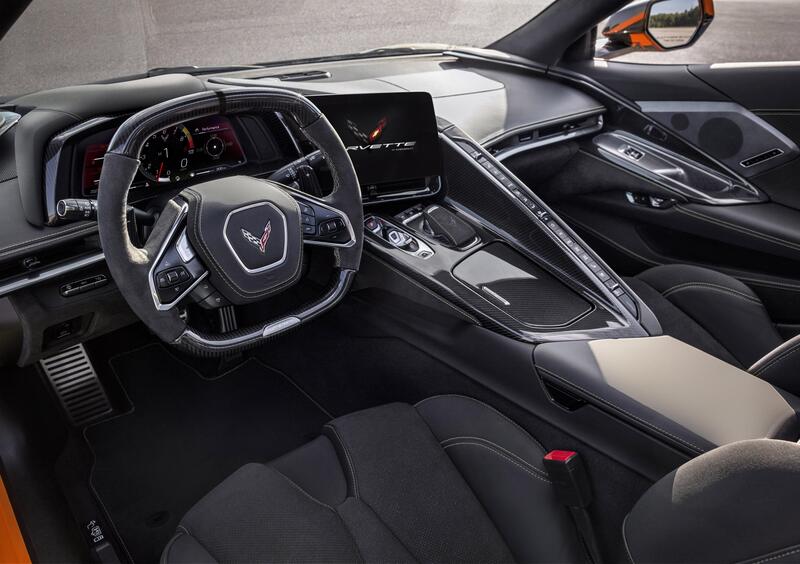 Carter secco e albero motore flat-plane, il nuovo motore non è il solo nuovo attore protagonista di questa nuova declinazione Corvette perché l’allargamento della carreggiata di 9,4 cm di nota come si notano le nuove ruote da 20” davanti e 21” dietro gommate 275/30 e 345/25 dietro frenate da dischi Brembo carboceramici con diametro da 370 mm e pinza a sei pistoncini.