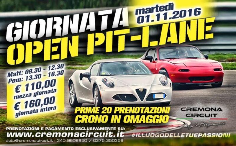 Al Cremona Circuit anche martedì 1 novembre 2016 ci sarà la possibilità di mettere alla prova le proprie abilità alla guida in una giornata Open Pit Lane. Dalle 9:30 alle 12:30 e dalle 13:30 alle 16:30 sarà possibile girare in pista con la propria auto.
