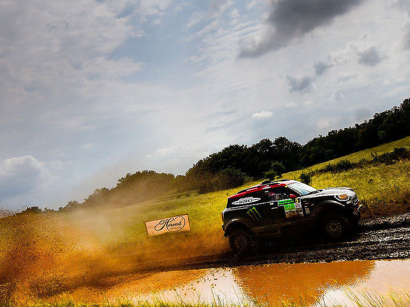 Veszprem, Ungheria, 29 Luglio 2018. Piove a catinelle sulla regione ungherese del Veszprem, il terreno diventa pesantissimo, ma non abbastanza per fermare la carovana della Baja Ungherese, l’Hungarian Baja, terza e ultima prova della Coppa del Mondo Baja FIM per le Moto, dopo Dubai e Aragon, e ottavo “round” di Coppa del Mondo FIA Cross-Country Rally & Baja. Tutt’al più vengono accorciate le due Speciali conclusive del Sabato, più per far rientrare la cerimonia in un contesto orario pertinente che non per effettiva impraticabilità del… campo.
