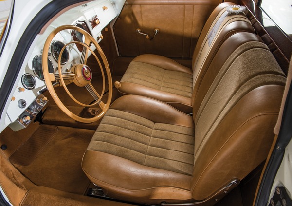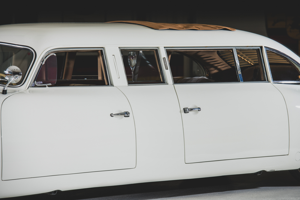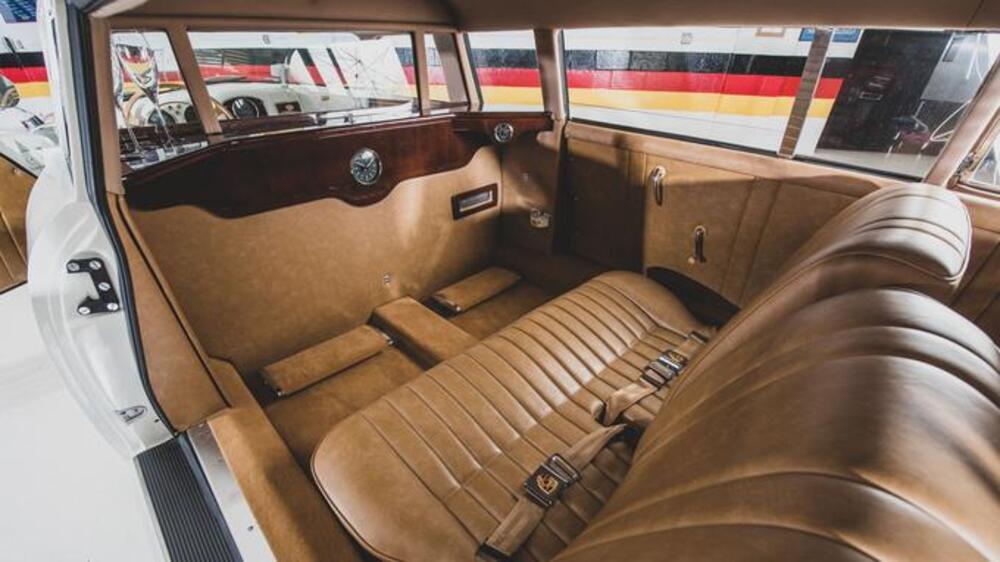 Questa 356 venduta in Francia da nuova e finita negli USA, è stata allestita, pare, per il matrimonio della figlia. Allungata, con quattro porte, interni lussuosissimi usando moquette e radica, più un dovuto separé, rispetto all’autista che non beveva certo lo champagne dai calici sempre presenti.