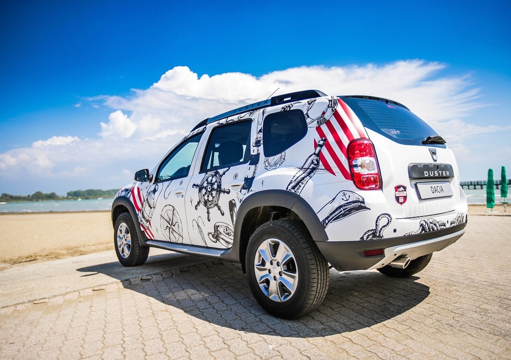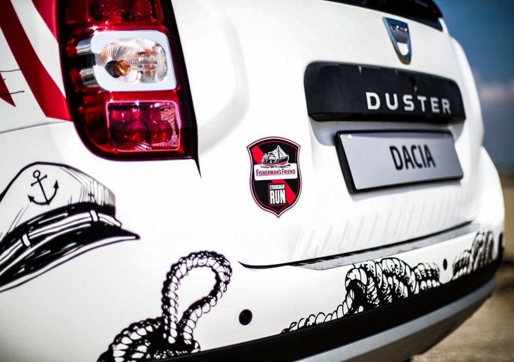 Caratterizzata da un “wrapping” bianco opaco con tetto nero a contrasto e una personalizzazione che si ispira al tema marinaro, molto vicino a quello delle famose caramelle Fisherman’s Friend, la Duster Strongman è dotata inoltre di protezioni sottoscocca satinate, pedane laterali, protezioni passaruota e cerchi in lega da 16”, barre tetto dark metal, vetri oscurati, terminale di scarico cromato, soglia bagagliaio, protezioni sottoscocca satinate e l’esclusivo badge “Fisherman’s Friend StrongmanRun” sul portellone posteriore.