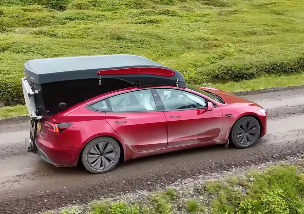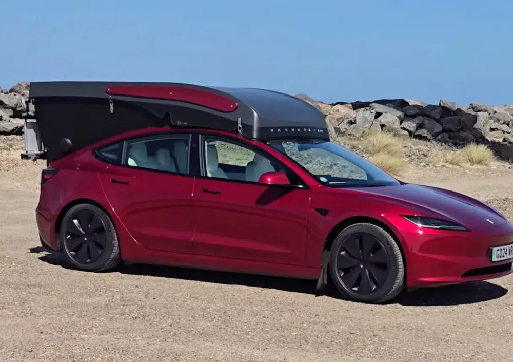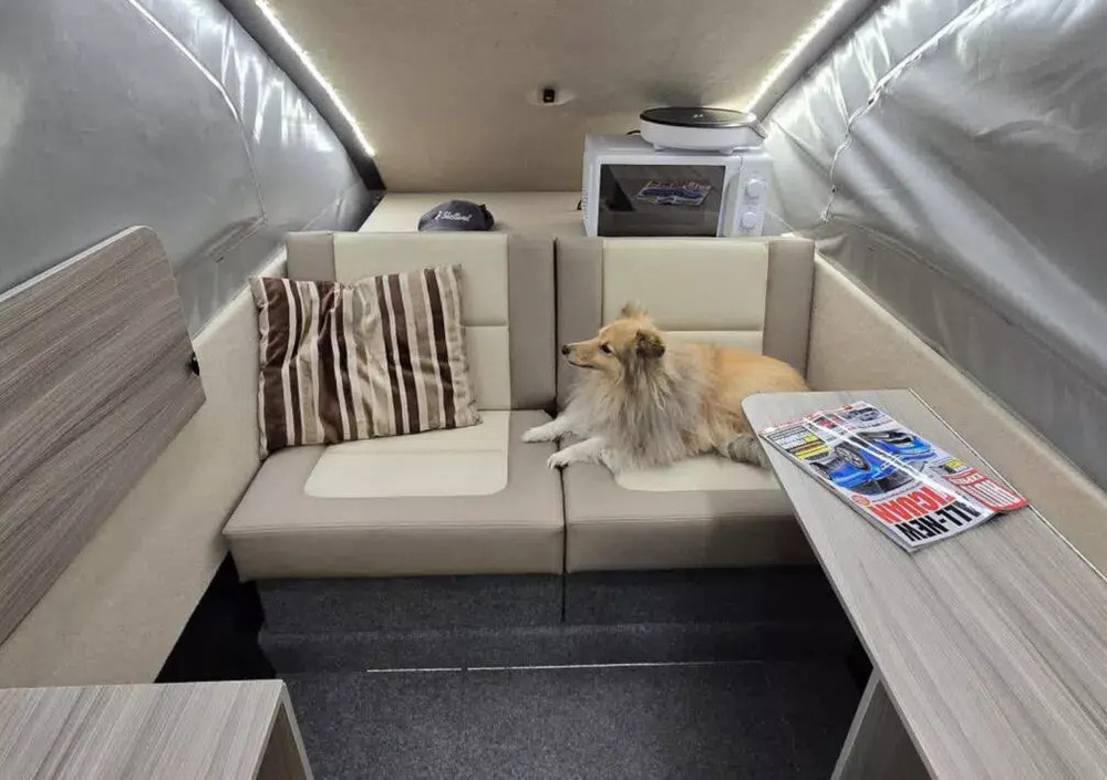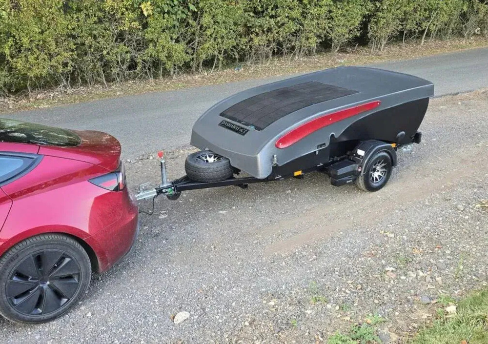 Il progetto, nato per un’auto elettrica, è diventato una roulotte per chiunque, facile da trainare anche con piccole utilitarie. Lunga appena 3,8 metri e con un peso di 340 kg, è pensata per essere aerodinamica e non penalizzare i consumi. Una volta parcheggiata, il tetto si solleva e permette di stare comodamente in piedi all’interno. La genialità sta nel design: mantiene lo stile della Tesla ma aggiunge uno spazio di stivaggio sotto al pavimento, grazie alla struttura da rimorchio. In pochi gesti diventa una mini casa su ruote completa di letto matrimoniale e angolo cucina.