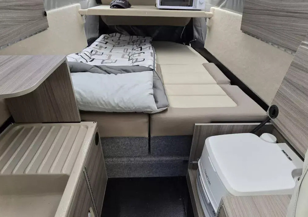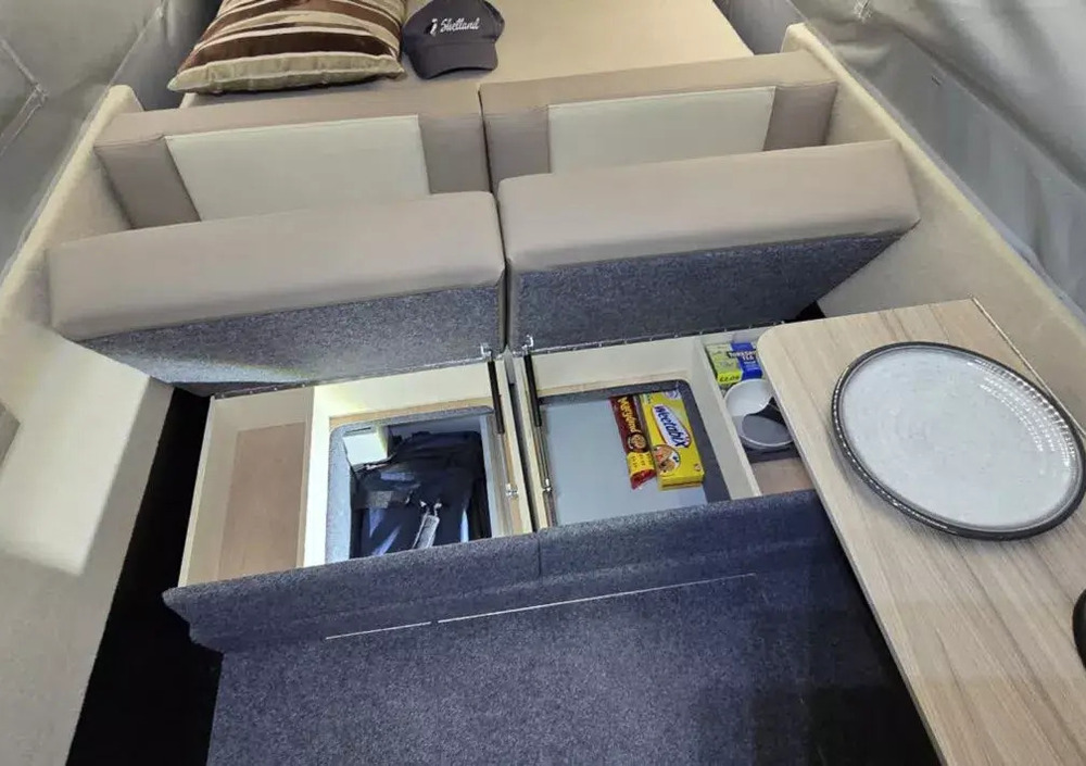 Dentro il Dashaway eCT si trova tutto ciò che serve per un weekend off-grid: un lavello con pompa elettrica e serbatoio da 10 litri, un piccolo frigorifero, e persino spazio per un WC portatile accessibile senza smontare il letto. L’alimentazione è garantita da una batteria al litio con inverter da 2.600 W e pannello solare da 200 W, che assicurano energia per almeno due giorni di campeggio autonomo.