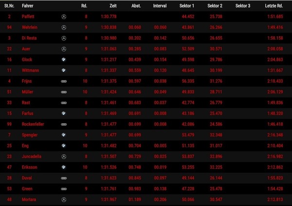 Il leader di classifica generale Paffett detta legge già dal primo run, chiudendo un ottimo giro in 1’30”778. Non si riesce a migliorare nonostante il cambio gomme. Nella seconda parte di sessione, la Mercedes n°94 di Wehrlein (1° nelle FP2) ha staccato un tempo a soli 60 millesimi dal best lap. Sotto il muro del 1’31, anche Di Resta: 3° con un tempo di 1’30”980. Poco più staccata la C 63 AMG di Auer. Seguono le BMW di Glock e Wittmann.