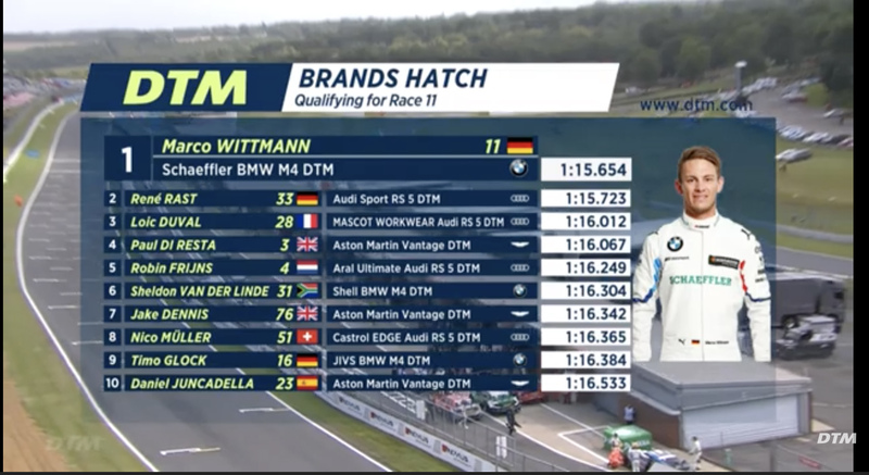 Un primo turno di qualifica ricco di colpi di scena, quello che ha inaugurato il weekend di Brands Hatch, sesto dei nove appuntamenti del DTM 2019. A conquistare sul circuito inglese la sua quarta pole della stagione è stato Marco Wittmann, protagonista nelle fasi conclusive con la BMW del Team RMG. Il tedesco ha rifilato soltanto 69 millesimi alla Audi del leader della classifica René Rast. Subito dietro, un'altra vettura della Casa dei quattro anelli, quella di Loïc Duval. Poi, a sorpresa, la prima delle Aston Martin guidata da Paul Di Resta. Per le vetture inglesi si è trattato di un vero exploit, con Jake Dennis su una seconda Vantage della R-Motorsport a lungo davanti a tutti e alla fine settimo, con il compagno di marca Daniel Juncadella agevolmente nella "top 10".
