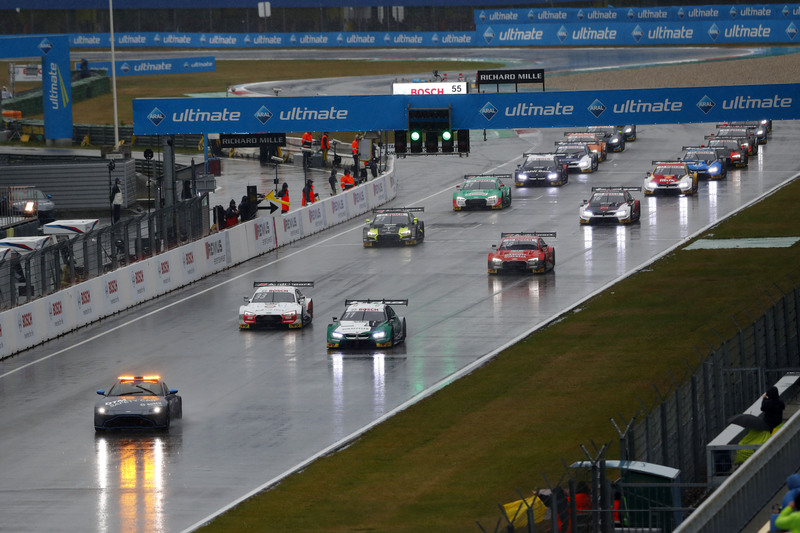 Pioggia e partenza dietro alla safety car, dunque, per questa prima gara del weekend. In pole, per la terza volta nel corso della stagione, la BMW di Wittmann. Dopo alcune tornate in regime di neutralizzazione, al “via” Rast ha subito provato ad attaccare il battistrada, il quale è riuscito però a conservare la posizione di testa. Poco più indietro, il testacoda di Sheldon van der Linde, speronato dalla vettura di Bruno Spengler. Quindi lo “stop” della Aston Martin di Daniel Juncadella (reduce dall'ottimo sesto posto messo a segno nel più recente round del Norisring) ed una nuova safety car per consentire di rimuovere la vettura dello spagnolo da una posizione pericolosa. Al restart Rast ci ha riprovato nei confronti di Wittmann, mentre Loïc Duval da dietro è rimasto a controllare la situazione. Quarto, ma più distanziato dai primi tre, Pietro Fittipaldi. Il brasiliano, nella sessione del mattino autore della sua migliore qualifica, ha avuto il suo da fare a tener d'occhio negli specchietti Müller e Timo Glock, con quest’ultimo autore però di un’escursione sulla ghiaia che lo ha fatto scivolare 12°. Subito dopo Müller ha superato Fittipaldi, portandosi in questo modo quarto. Il primo a effettuare il pit-stop è stato Jamie Green. Duval nel frattempo ha iniziato a perdere terreno, permettendo così a Müller di avvicinarsi e di passarlo a 32 minuti dallo scadere del tempo.