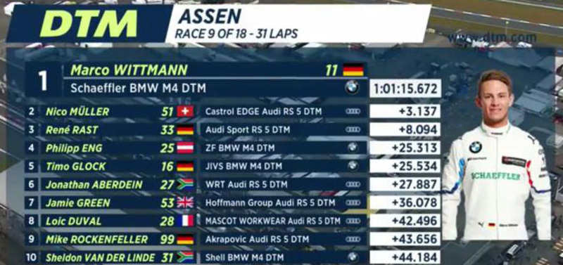 Marco Wittmann centra il suo terzo successo della stagione e pareggia i conti con René Rast. Ad Assen il tedesco del BMW Team RMG è stato il "re della pioggia", dominando la prima delle due gare del quinto round del DTM 2019. Un successo, quello ottenuto dal due volte campione della serie, condito anche dalla pole (conquistata però in condizioni di asciutto). Subito dietro ha concluso la Audi di Nico Müller, autore di una strategia perfetta. Lo svizzero dell'Abt Sportsline ha effettuato il suo pit-stop quando mancavano solo sei giri dal termine, riuscendo poi a tenere dietro fino al traguardo la vettura gemella di Rast, leader del campionato, nei cui confronti ha guadagnato qualche "punticino".