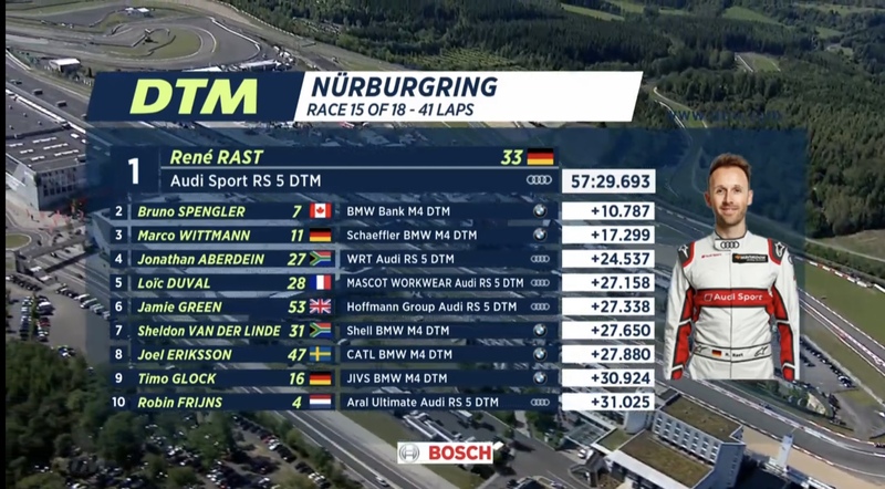 A una ventina di minuti dalla fine, il ritiro di Rockenfeller, rientrato mestamente ai box con il motore "kappaò", lasciando la seconda posizione a Spengler. Wittmann si è così ritrovato terzo. Alle sue spalle hanno concluso le Audi di Aberdein, Duval e Green. Poi le altre BMW di Van der Linde, Joel Eriksson e Timo Glock, con Robin Frijns (Audi) a completare la "top 10".