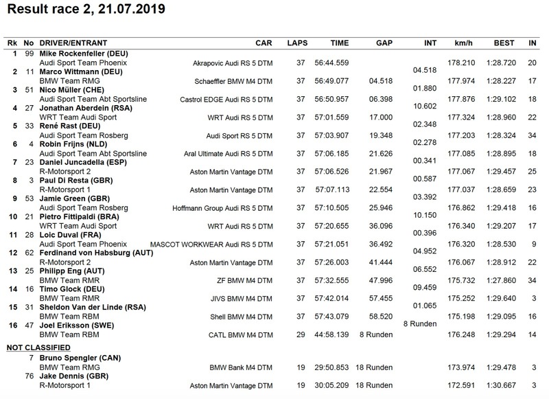 Il leader della serie René Rast ha iniziato nel migliore dei modi la giornata, facendo registrare la sua quarta pole position di quest'anno. Poi il tedesco è stato anche autore di una partenza perfetta che gli ha permesso di conservare il comando delle operazioni fino a 11 minuti dallo scadere del tempo utile. È stato infatti in quel frangente che la sua squadra lo ha richiamato ai box per effettuare una seconda sosta. Strategia costata cara al pilota dell'Audi Sport Team Rosberg, che dopo essere rientrato in pista 14° ha comunque tirato fuori gli “artigli” fino a raggiungere il quinto piazzamento, lottando nelle fasi conclusive con Robin Frijns (Audi Sport Team Abt Sportsline) e lo spagnolo Daniel Juncadella (Aston Martin Vantage/R-Motorsport), nell'ordine sesto e settimo. Bene anche il sudafricano Jonathan Aberdein (WRT Team Audi Sport), che dopo avere sbagliato la partenza scivolando da secondo a ottavo, ha mantenuto la giusta concentrazione che gli ha permesso in seguito di concludere quarto.