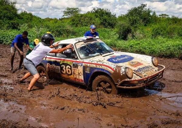 Corsa difficile. Leggendaria e molto dura. Imprevedibile. Niente affatto scontata o “affidabile” sulle proprie premesse. Meteo scherzoso e furioso, piste che spariscono sotto un mare di fango, fiumi che diventano oceani e limiti invalicabili. Confrontarsi con situazioni che travalicano la bravura e si perdono nella fortuna sempre in bilico, è stato il difficile della vittoria di Eugenio. Come quel giorno in cui, con mezz’ora di vantaggio conquistata minuto dopo minuto per una leadership che durava dalla terza delle nove tappe, il guado è diventato un fiume in piena, duecento metri da attraversare, e ci son riusciti solo loro, Eugenio e Paolo. La corsa poteva finire lì, invece è stata annullata la tappa e sono rientrati tutti, tutti dentro e la gara ricominciava. O come quell’altra volta che, per una nota sbagliata, Amos e Ceci, partiti in testa e da soli ad aprire la strada nel bush, si son giocoforza persi nella savana e dopo, nel dubbio, hanno perso altro tempo per raccapezzarsi in un rebus impossibile disegnato dall’errore altrui. Quella volta tutti gli altri erano stati guidati sulla pista giusta, e con quella soluzione sembrava che i leader fossero condannati, invece, no, l’East African Safari ha ritrovato la pista della giustizia e le cose sono andate al loro posto. Amos ha battuto il campione in carica, il keniano Baldev Chager, co-pilota Gareth Dawe, e il campione austriaco del 2019 Kris Rosenberger, una vecchia conoscenza dakariana, in compagnia della moglie Nicola Bleicher. Tutti su Porsche 911.
