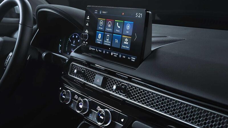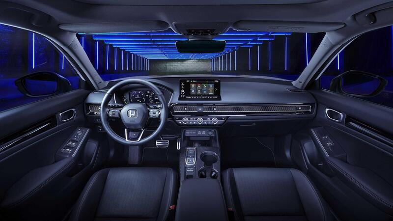 Proprio la parte di portellone ha volumi e materiali non comuni ad altri. Uso di resina leggera e una la linea a metà tra berlina e due volumi. In abitacolo la Honda Civic e:HEV usa un'areazione a tutta larghezza e una strumentazione da 10,2", senza esuberi di touchscreen per l'infotainment: 9".