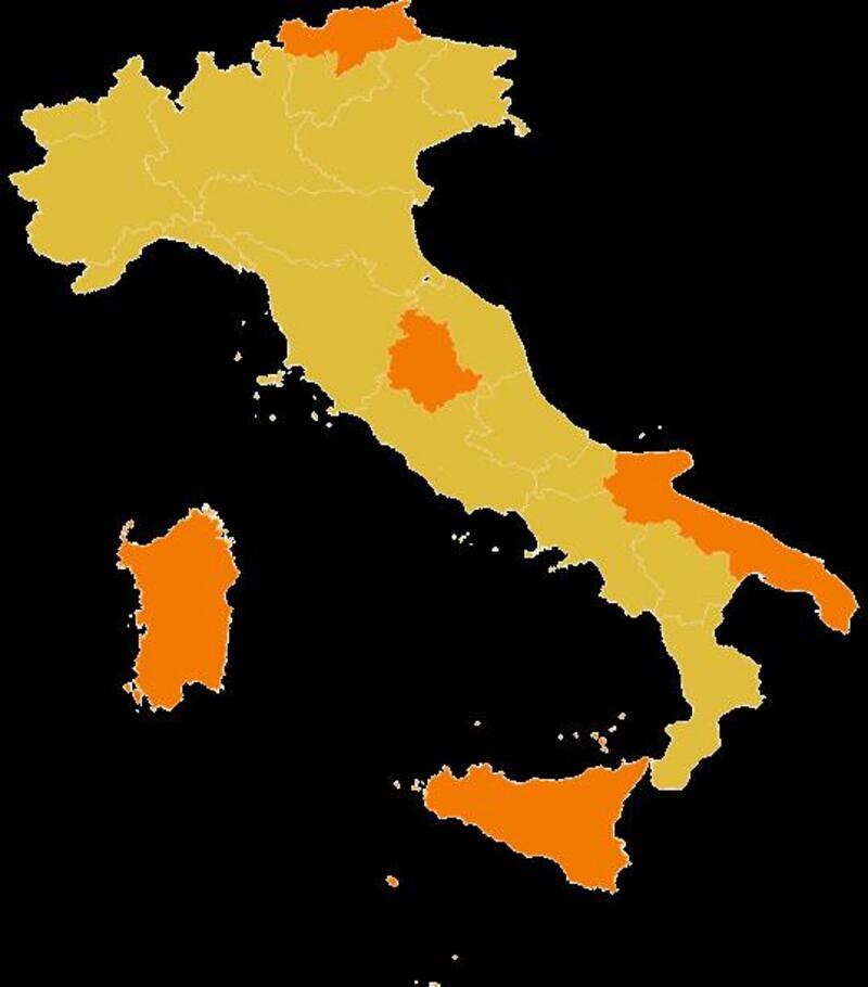 Tutte le altre zone d'Italia sono zona gialla. Campania, Toscana, Molise, Basilicata e Provincia di Trento e le promosse: Lazio, Piemonte, Val d’Aosta, Marche, Friuli, Abruzzo, Lombardia, Veneto, Emilia, Calabria e Liguria.