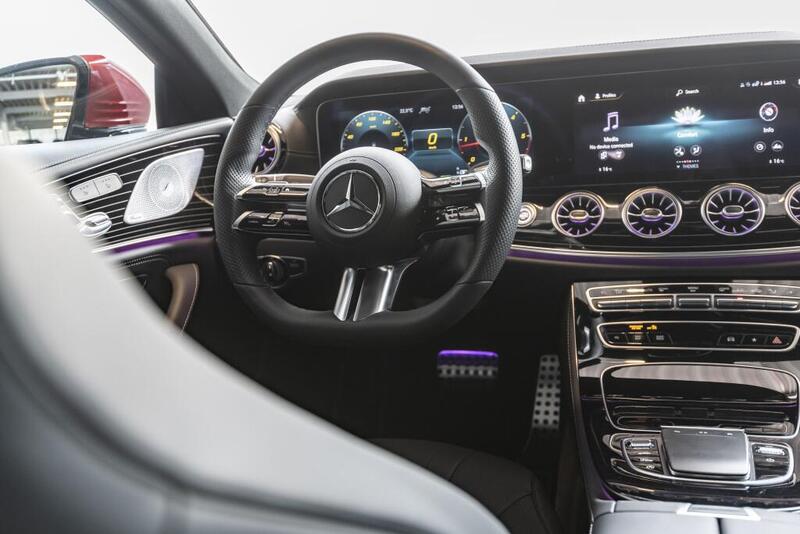 Davanti nuova mascherina radiatore (pattern Mercedes 3D) e anche paraurti, con grembialatura AMG, A-Wing nero, splitter frontale color cromo argentato, griglie delle prese d'aria con listelli verticali e flic aerodinamici in nero a specchio. Dedicati anche i rivestimenti sottoporta e lo spoilerino dietro, sempre AMG. I cerchi in lega sono da 20 pollici in look bicolor e, a proposito di colori, per la rinnovata CLS la Casa spinge anche quelli vivaci, come il blu spettrale metallizzato o l’arancio.