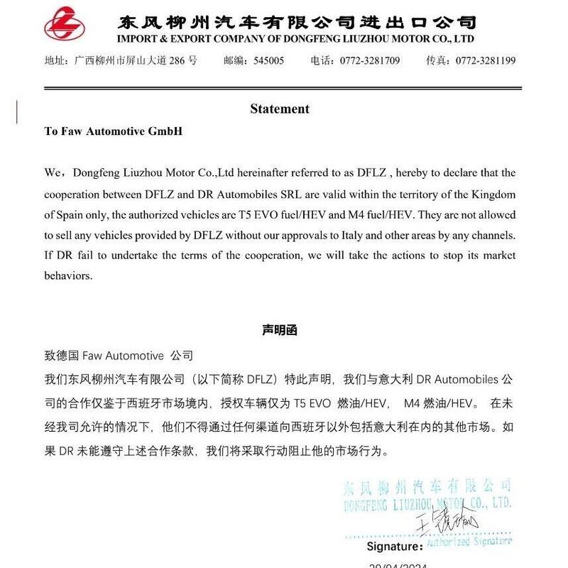 La cinese Dongfeng Motor Group di Wuhan potrebbe essere la prima casa del Dragone ad aprire uno stabilimento in Italia, secondo fonti della Reuters. I colloqui con il Governo italiano sono ad uno stadio piuttosto avanzato con quello che è il quarto costruttore cinese di proprietà dello Stato e gli obiettivi sono quelli di produrre in Italia circa 100.000 veicoli ibridi. La fabbrica potrebbe essere poi un hub per l'esportazione di veicoli cinesi in tutto il resto d'Europa. L'accordo potrebbe vedere una partecipazione minoritaria dello Stato italiano nell'azionariato di una nuova Company creata per l'investimento e vedere anche la partecipazione di altri investitori, segnatamente le fabbriche di componentistica.