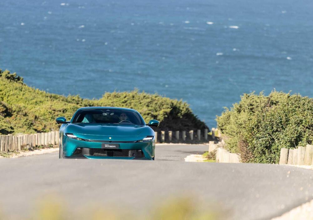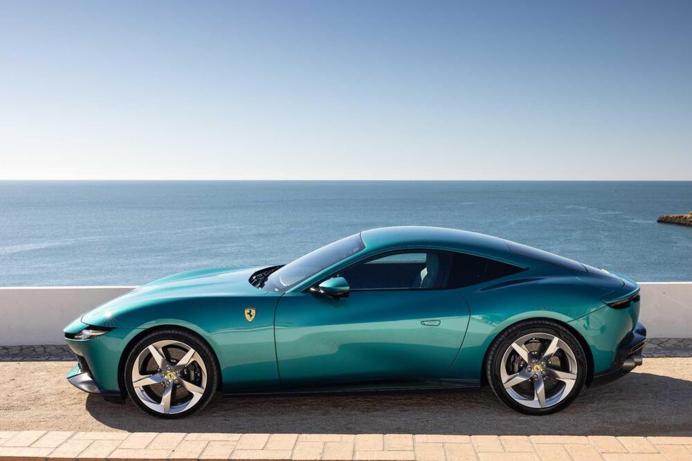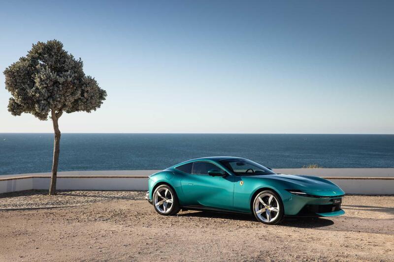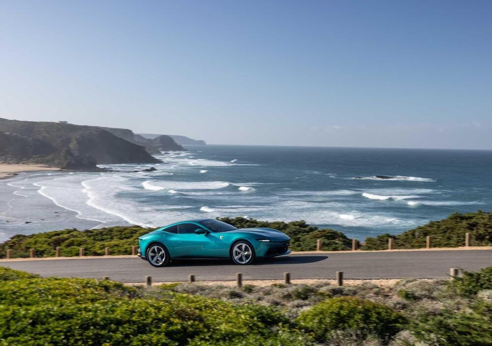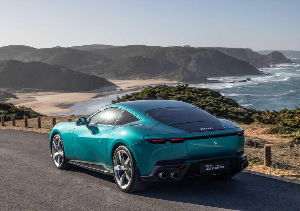 Il posteriore è definito da una linea di forza che avvolge l'intero volume, culminando in una coda compatta e asciutta. I gruppi ottici sono nascosti all'interno di tagli grafici essenziali che evocano le Ferrari del passato, mentre il diffusore ampio e funzionale dichiara apertamente la vocazione aerodinamica della vettura. A sottolineare la personalità della nuova nata, il colore di lancio è il Verde Costiera, un verde ottanio brillante ispirato ai riflessi del mare della costiera amalfitana che esalta magnificamente le superfici.
