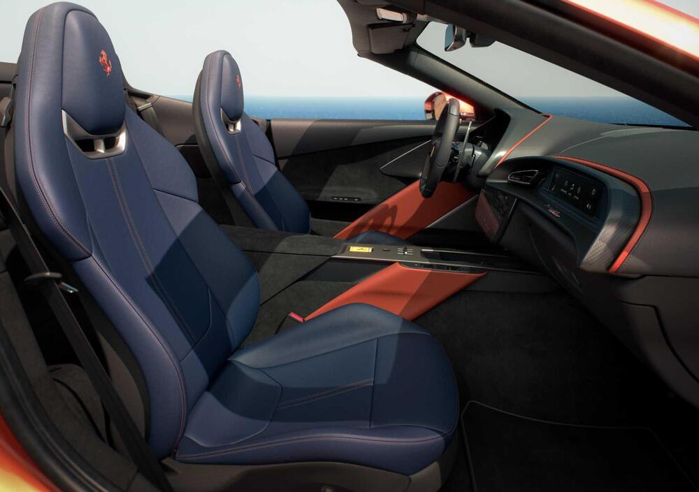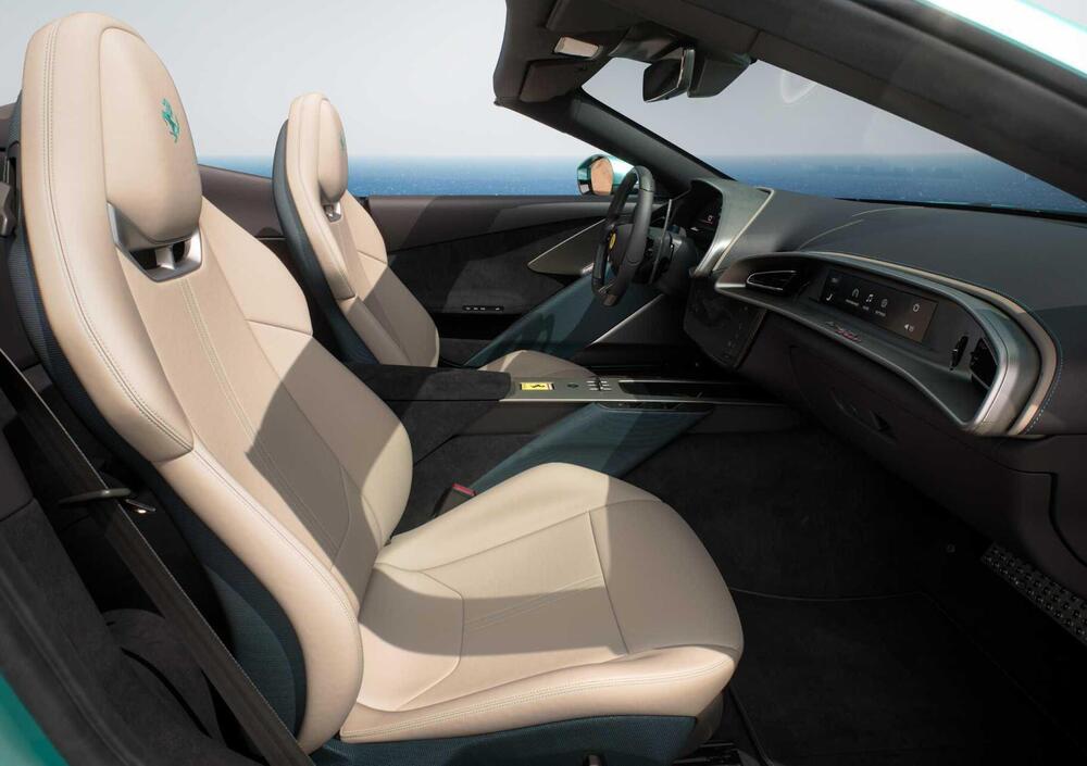 L'abitacolo riprende l'impostazione a doppio cockpit già vista sull'Amalfi coupé, con una separazione netta tra le aree del pilota e del passeggero che accentua il carattere sportivo dell'ambiente. Il volante torna ai tasti fisici per le funzioni principali - una scelta sempre più comune nel panorama del settore, ma che su Ferrari acquisisce anche un valore simbolico - e riporta l'iconico tasto di accensione, elemento identitario del brand che nelle ultime generazioni era stato ridisegnato o riposizionato. Il display centrale è integrato nella plancia con un'impostazione pensata per garantire un'interazione naturale anche durante la guida più dinamica.