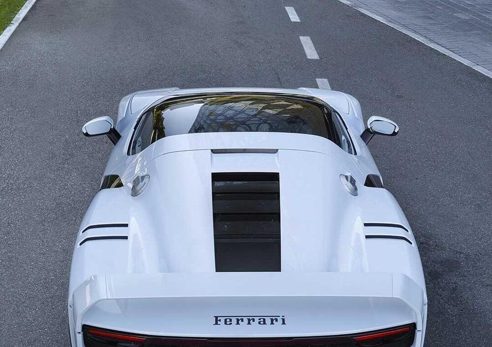 Il colore Bianco SC40, sviluppato appositamente per questa vettura, amplifica la purezza delle superfici e sottolinea la tensione dinamica delle forme. Sul posteriore, la fascia a griglia per lo smaltimento del calore e le louvres in Lexan fumé completano un linguaggio visivo coerente e inconfondibile.