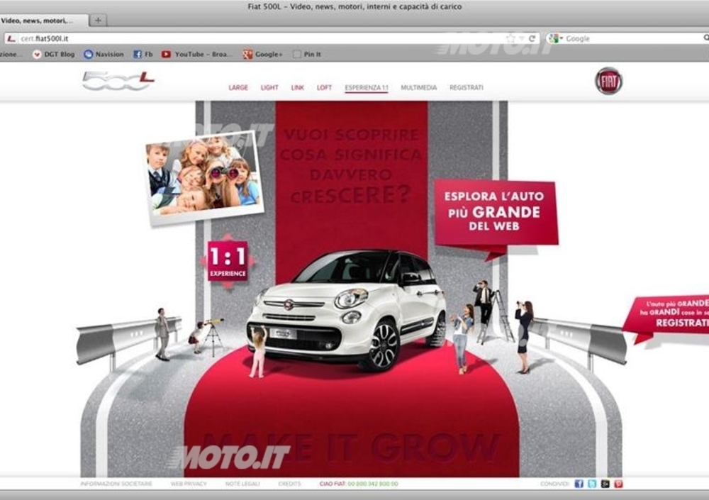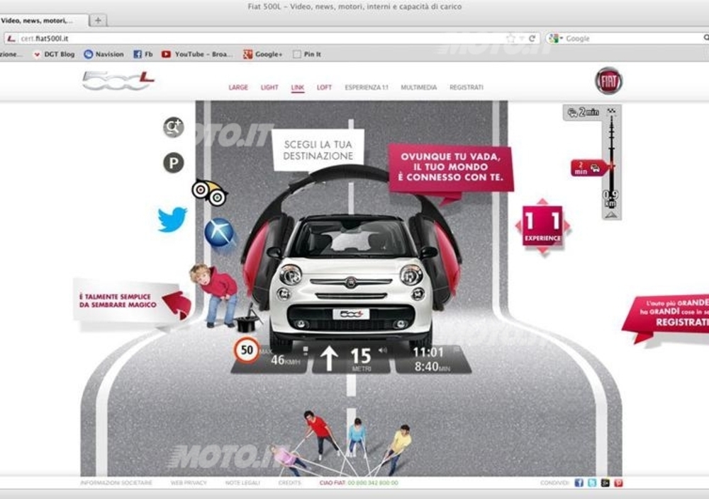 Sempre nella home page, quattro categorie che contraddistinguono le specificità dell'automobile (Large, Light, Link e Loft) consentono di scoprire i punti di forza e le caratteristiche peculiari della vettura. Inoltre, con semplici clic su specifiche icone, è possibile ammirare la 500L attraverso foto, video, animazioni grafiche e testi.