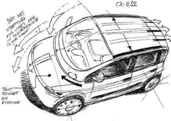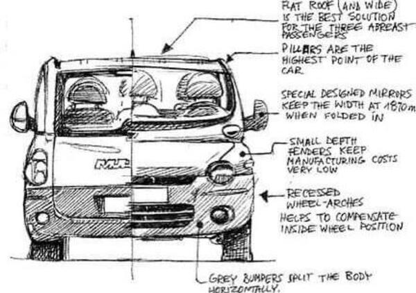 Tra le meraviglie della collezione di Corrado Lopresto, tra i maggiori esponenti del collezionismo di auto italiano, ci sono anche i bozzetti di una vettura inconfondibile di casa Fiat, la Multipla. L'idea della monovolume nacque nel 1996 dalla matita di Roberto Giolito, attualmente responsabile di FCA Heritage. Il primo dei bozzetti che vi proponiamo mostra uno schizzo dell'esterno, che presenta una firma luminosa squadrata all'anteriore, oltre al concept della plancia e alla struttura della fiancata, con la separazione ideale tra telaio e carrozzeria.