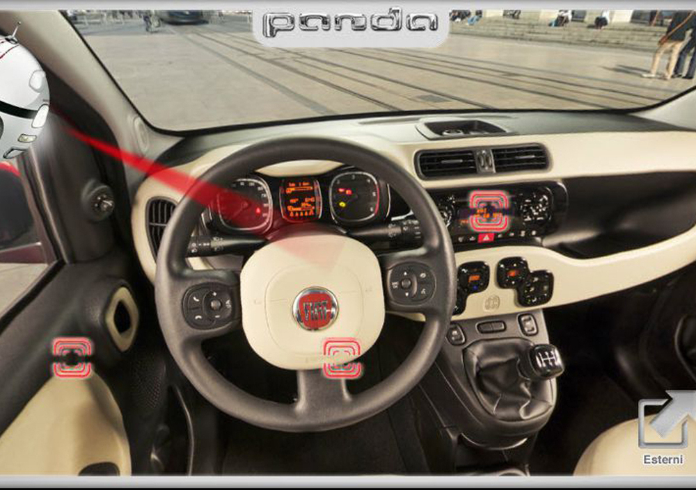 Inoltre è possibile non soltanto far ruotare la Panda e ammirarne così le linee esterne, ma si può esplorare il suo interno volgendo lo sguardo in ogni direzione come se si fosse seduti al posto guida. Fasci di luce provenienti dal robot illuminano alcuni "hotspot", cliccando i quali è possibile vedere video e leggere brevi testi di approfondimento su design, tecnologia e flessibilità della nuova nata in casa Fiat.