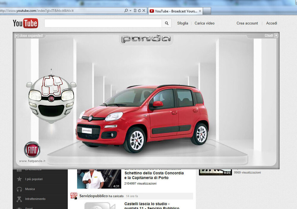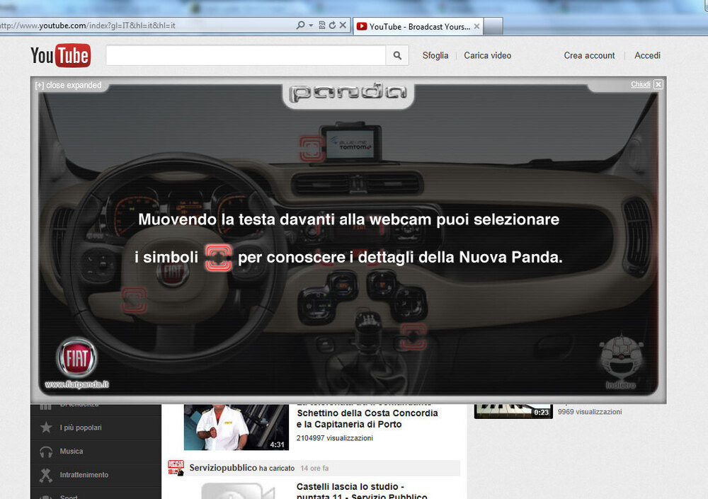 Chiunque oggi abbia aperto la homepage di YouTube non avrà potuto fare a meno di notare un banner espandibile dedicato alla nuova Fiat Panda, dove un robot guida permette agli utenti di visualizzare sia gli interni che gli esterni della terza generazione della city car torinese grazie ad un sistema interattivo (volto a dialogare con webcam e mouse) denominato face tracking.