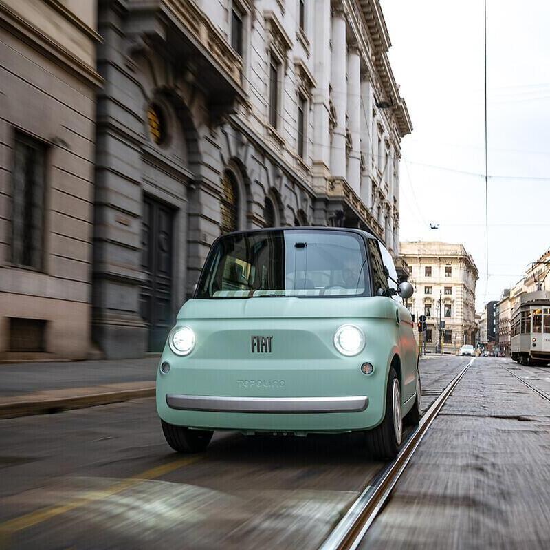 Si possono vedere le due varianti di carrozzeria, una chiusa e una aperta, entrambe caratterizzate da un unico colore, il Verde Vita, un design dei cerchi unico. Nello stand Fiat è stato riprodotto come in un diorama (ma in scala 1:1) un angolo di Milano, per la precisione via Abramo Lincoln con tanto di lampioni, panchine e pavimentazione urbana, una sottolineatura della agilità e dell'adattabilità di questo quadriciclo leggero, che si può guidare a 14 anni, nel contesto di una città trafficata e povera di parcheggi come Milano. La Topolino è lunga solo 2,53 metri e, come tutti i veicoli guidabili con la patente AM, può arrivare a 45 km/h; ha una batteria da 5,4 kWh che le consente di viaggiare per circa 75 km e si ricarica in casa con una presa Schuko. Per questo modello la Fiat mette a disposizione anche l'acquisto online, il finaziamento e la consegna a domicilio a partire da gennaio 2024. Per la "prova su strada" (qui il nostro video) si può andare in concessionaria dai primi di dicembre.