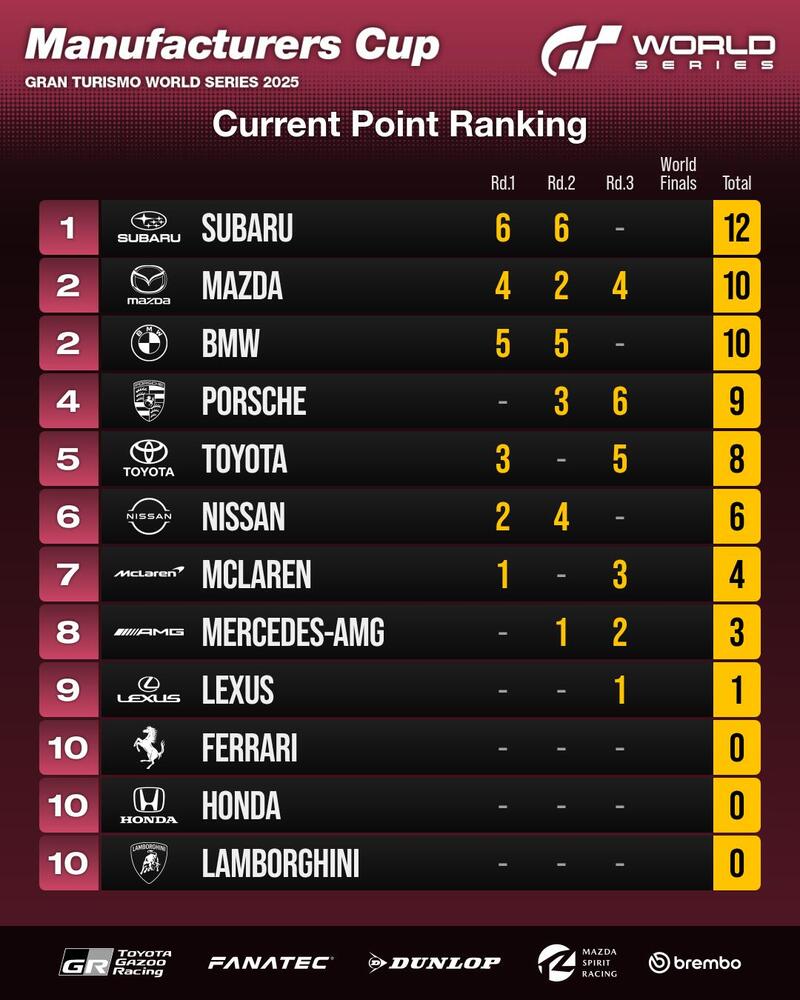 I costruttori si sono presentati alle finali di Fukuoka in questo ordine, con un risultato soprendente in cui Subaru era al comando della classifica nonostante un sonoro 0 punti nella tappa di Los Angeles