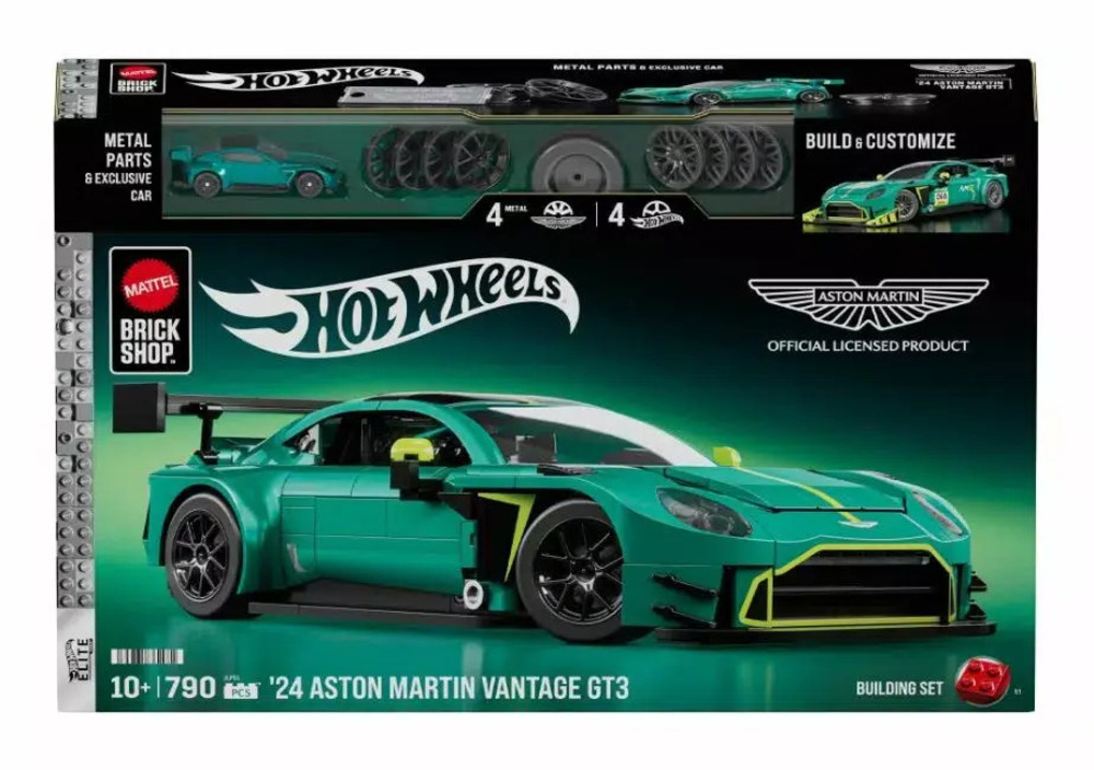La Aston Martin Vantage GT3, una delle vetture più iconiche dell’endurance racing moderno con successi nel GT World Challenge Europe e negli appuntamenti IMSA, debutta in una nuova veste accessibile anche a chi non ha un box pieno di vetture da corsa: un modellino da costruire di Mattel Brick Shop. Questo nuovo kit, inserito nella linea Hot Wheels Elite, permette di ricreare la celebre GT3 in formato 1:16 con sorprendente attenzione ai dettagli, e include addirittura una versione die-cast in scala 1:64.