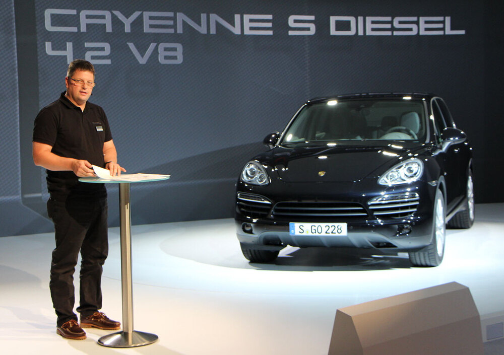 «Quando ho guidato per la prima volta la Cayenne S diesel avevo un gran sorriso. Ero colpito non tanto dalle elevatissime prestazioni (0-100 in 5,7 seocndi, 80-120 km/h in e 252 km/h di velocità massima) ma dalla piacevolezza del sound e dall'erogazione di questa nuova unità. Noi di Porsche siamo estremamente viziati sotto questo punto di vista e devo dire che l'impianto di scarico che abbiamo messo a punto svolge egregiamente il lavoro di abbattimento delle emissioni (218 g/km di CO2 e filtro antiparticolato di serie) ma soprattutto assicura un sound inconfondibile, da V8 benzina. Questa vettura è 100% sportività Porsche. E' entusiasmante.»
