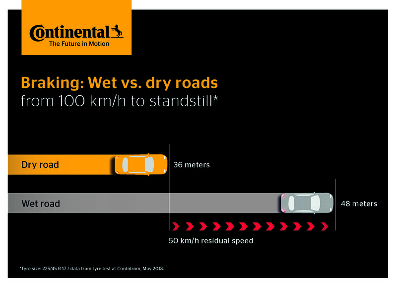 Su un fondo stradale bagnato la distanza di arresto dei veicoli aumenta considerevolmente e il Centro Studi Continental ricorda quanto sia importante tenere sempre sotto controllo il battistrada e aumentare la prudenza alla guida.