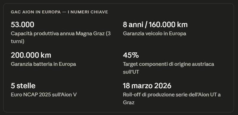 Lo stabilimento Magna di Graz resta l'unico sito produttivo europeo, con una capacità pianificata di circa 53.000 unità annue su tre turni. Alla domanda se si possa immaginare una produzione in Italia, Zhang sorride ma non si lascia tentare: "Magna non è la soluzione più economica, ma è la migliore" L'accordo fra GAC e Magna, annunciato ufficialmente il 21 novembre 2025, punta a una localizzazione progressiva dei componenti, con un obiettivo del 45% di origine austriaca sull'UT. Sul fronte batterie - attualmente importate dalla Cina - il gruppo sta valutando opzioni europee, senza ancora comunicare tempistiche.