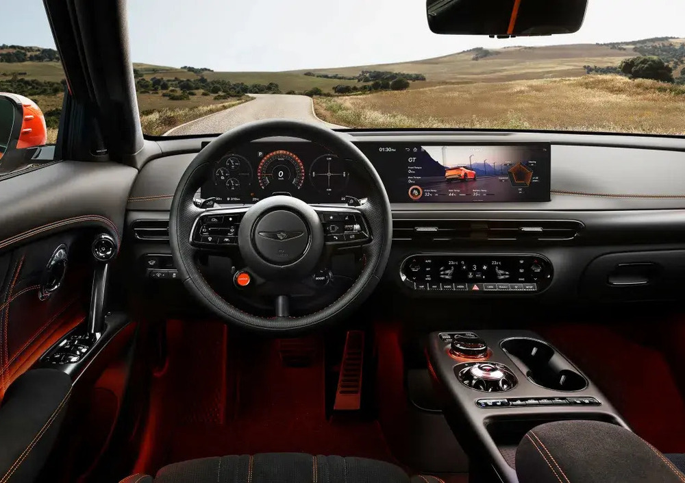 Accanto alla meccanica, Genesis introduce un ambiente digitale che in modalità Magma cambia completamente. Il quadro strumenti adotta un layout a tre cerchi che mostra temperatura di motori e batteria, velocità, forza G e stato del Boost. L’Head-Up Display fornisce informazioni chiave come frenata rigenerativa e durata della modalità potenziata. In più, la GV60 Magma dispone di funzioni esclusive come il Virtual Gear Shift System (VGS), che simula la cambiata di un motore termico ad alte prestazioni modulando potenza, coppia, rigenerazione e persino il sound design. È un modo per rendere più coinvolgente la guida di un’elettrica ad alte prestazioni, ricreando sensazioni familiari per gli appassionati.
