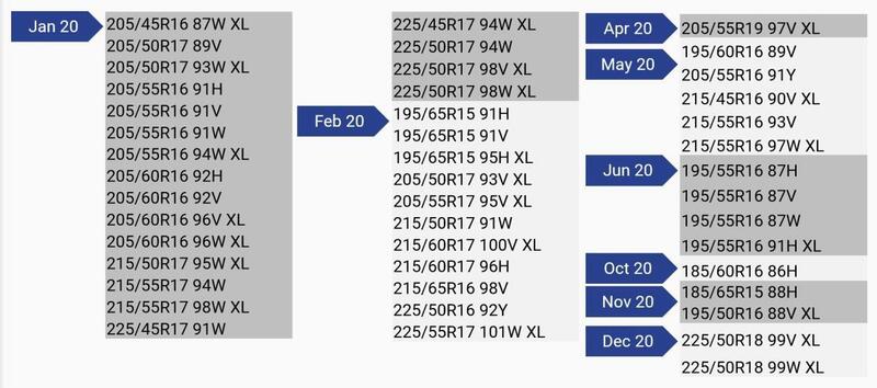 Al centro della gomma, invece, le costolature del battistrada sono stati allargate e offrono più stabilità in situazioni di emergenza. Il nuovo Goodyear EfficientGrip Performance 2 sarà disponibile in 45 misure, che verranno introdotte durante il corso dell’anno: l'immagine qui sotto ci fornisce una rapida preview.