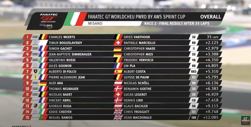 Doppietta dell'Audi che s'impone anche nella gara 2 di Misano: è la RB GTE n°32 di Charles Weerts e Dries Vanthoor a tagliare per prima il traguardo nell' ottavo round del World Challenge Europe Sprint Cup. I due belgi come ieri hanno dominato invertendosi i ruoli, con Vanthoor che ha allungato nel primo stint, e Weerts che ha amministrato il vantaggio, precedendo di due secondi e uno la Mercedes AMG GT3 n°89 di Raffaele Marciello e Timur Boguslavskiy.