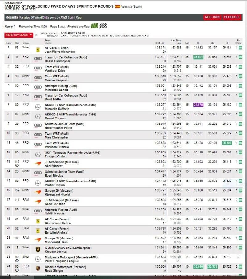 Nella gara 1 di Valencia s'impone la Ferrari: è stata la 488 GT3 AF Corse n.53 di Ulysse De Pauw e Jean-Pierre Alexandre a tagliare per prima il traguardo nella penultima prova del GT World Challenge Europe Sprint Cup. Quella al Ricardo Tolmo è la loro seconda vittoria stagionale, con De Pauw che difesa la prima posizione al via ha dominato nel primo stint, mentre Jean-Pierre ha visto annullato il vantaggio che aveva costruito il compagno di squadra, e al rientro ai box della safety car ha dovuto resistere alle Audi R8 LMS Evo n.11 Christopher Haase, e la n.32 di Dries Vanthoor. Il belga insieme a Charles Weerts con il gradino più basso del podio si laureano per il secondo anno consecutivo campioni del mondo, della Sprint Cup.