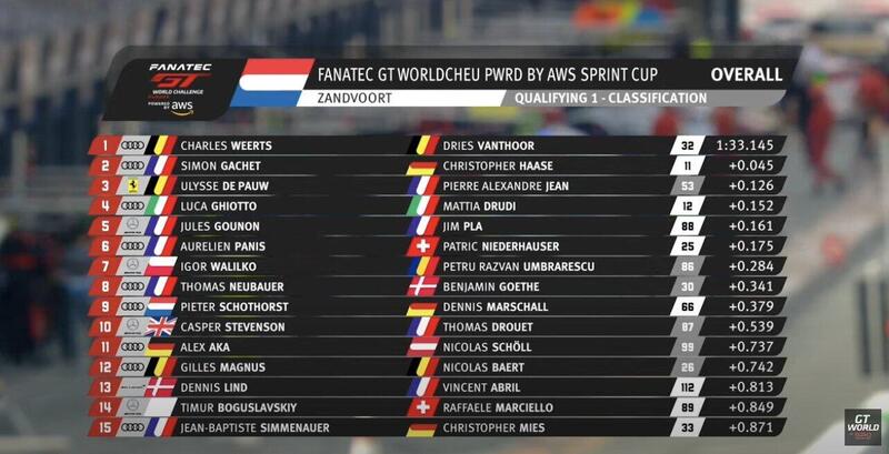 Audi in pole pole position nelle qualifiche di gara 1 di Zandvoort: sarà la R8 LMS Evo n°32 di Charles Weerts e Dries Vanthoor a partire davanti a tutti nel quinto round del GT World Challenge Europe Sprint Cup. Weerts con il crono di 1.33.145 è stato autore del miglior tempo assoluto, battendo di 45 millesimi Simon Gachet che completa l'uno-due dell'Audi.