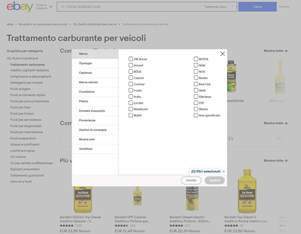 È sempre possibile verificare le indicazioni del tipo motore e i codici prodotto, prima di comprare. Oppure chiedere, ai tanti venditori professionali di eBay che rispondono prontamente. Una volta entrati nella sezione dedicata agli additivi auto, si possono filtrare i moltissimi risultati e le offerte: secondo marca, tipologia, capienza del contenitore liquido, ovviamente prezzo e anche una selezione dei più venduti.