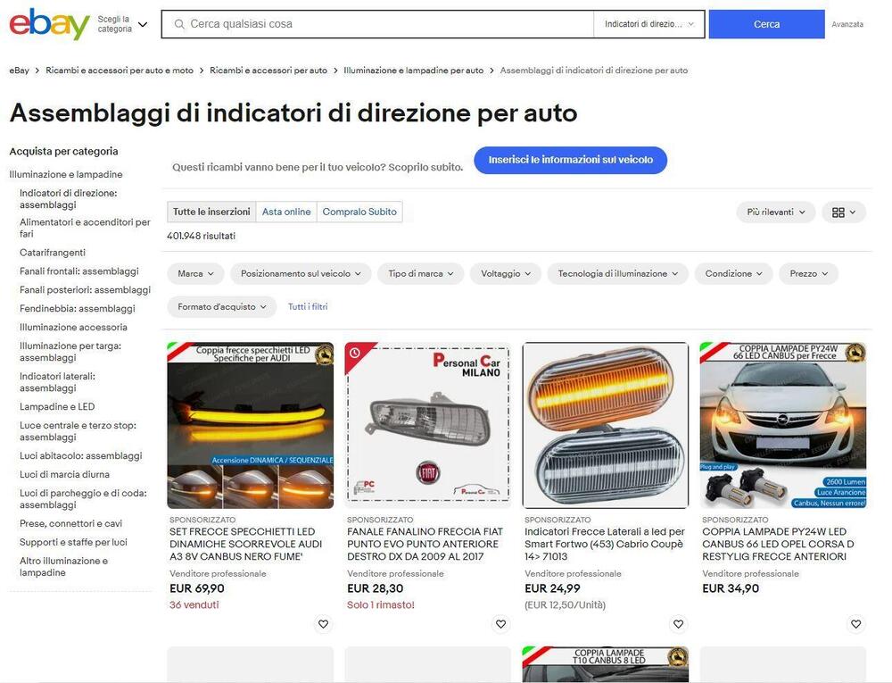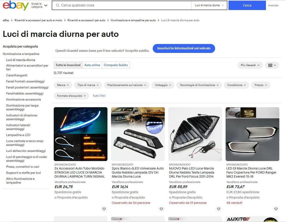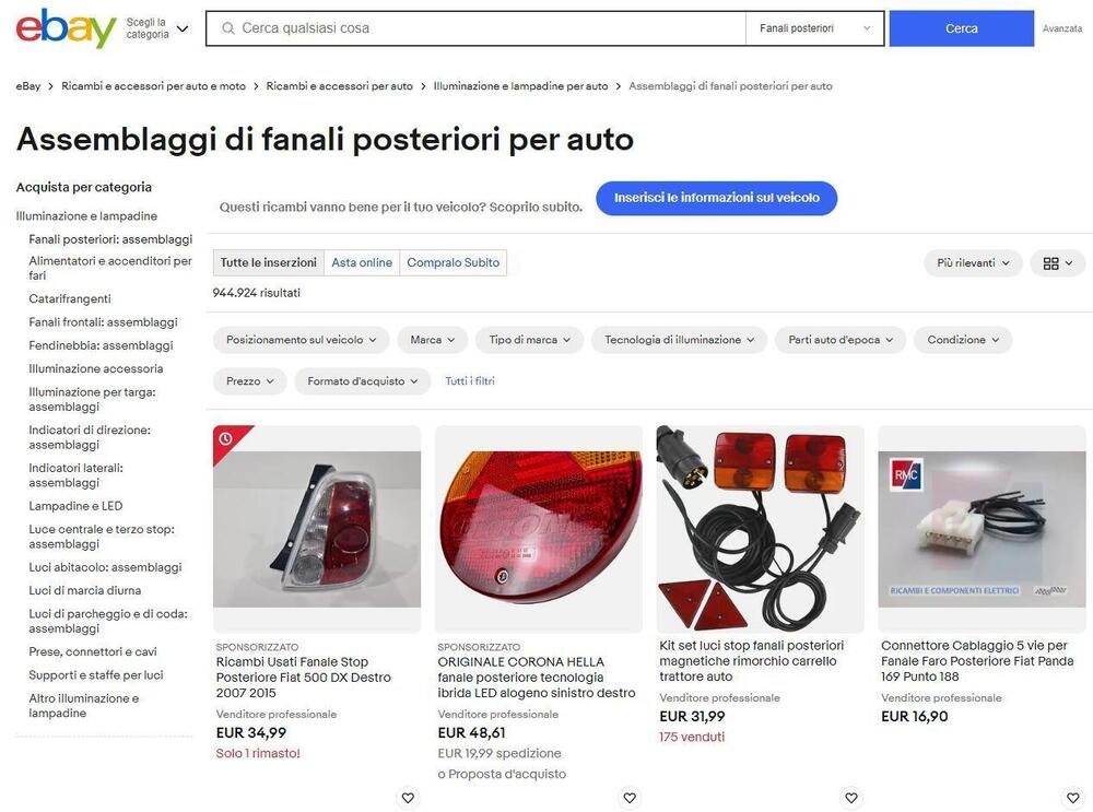 Nella selezione illuminazione, eBay aiuta molto gli utenti, avendo non solo una ricca parte dedicata ai fanali auto, anteriori e posteriori, o la ricerca per targa, ma anche la funzione My Garage. Dove registrando la propria auto sono proposti solo i ricambi compatibili.