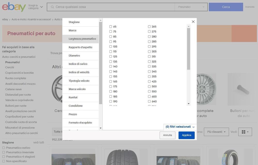 Sempre eBay offre buone descrizioni del pneumatico in vendita, con tanto di feedback e qualche opinione condivisa, per confermare le impressioni. Grazie ai filtri attivabili nella ricerca degli pneumatici, su eBay è facile scremare per marca, se si desideri per esempio una duratura Michelin, piuttosto che una sportiva Pirelli. Oppure si può anche cercare per misura, per indice, scoprendo le molte alternative disponibili che calzano precisamente alla propria vettura.