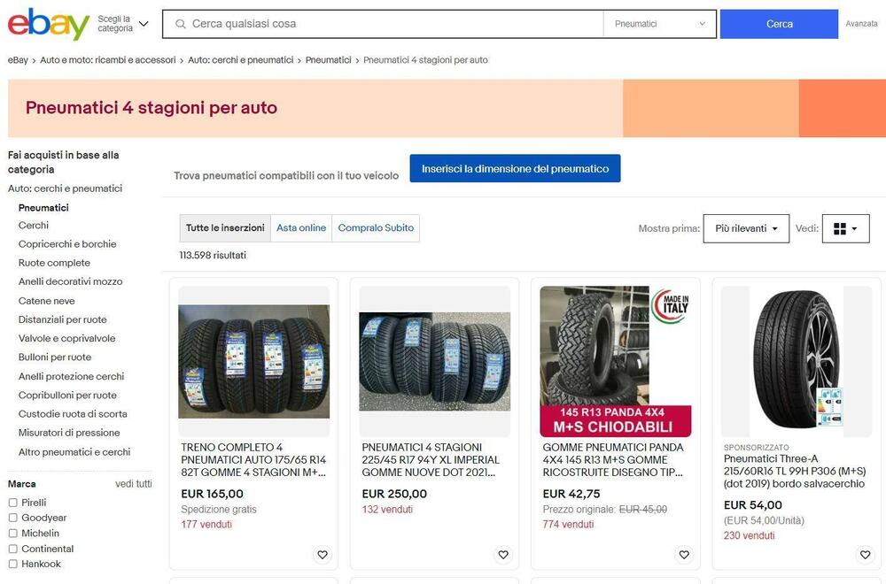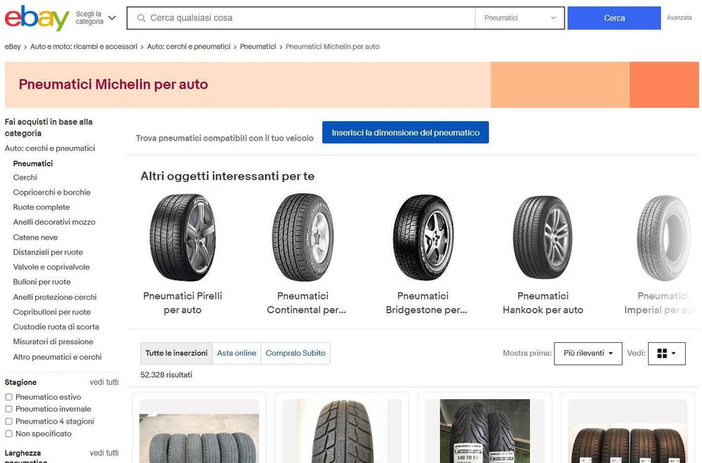 Ovviamente, si può restringere la ricerca anche secondo parametri come il tipo di gomma, se estiva, invernale o 4S. Volendo ci sono su eBay anche pneumatici ricostruiti e usati. Elencando i risultati, si può dare priorità al costo scoprendo il venditore più conveniente per il pneumatico voluto, o quello che accetta offerte sul prezzo base d’asta.