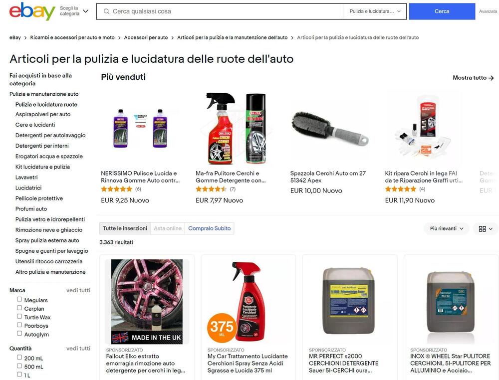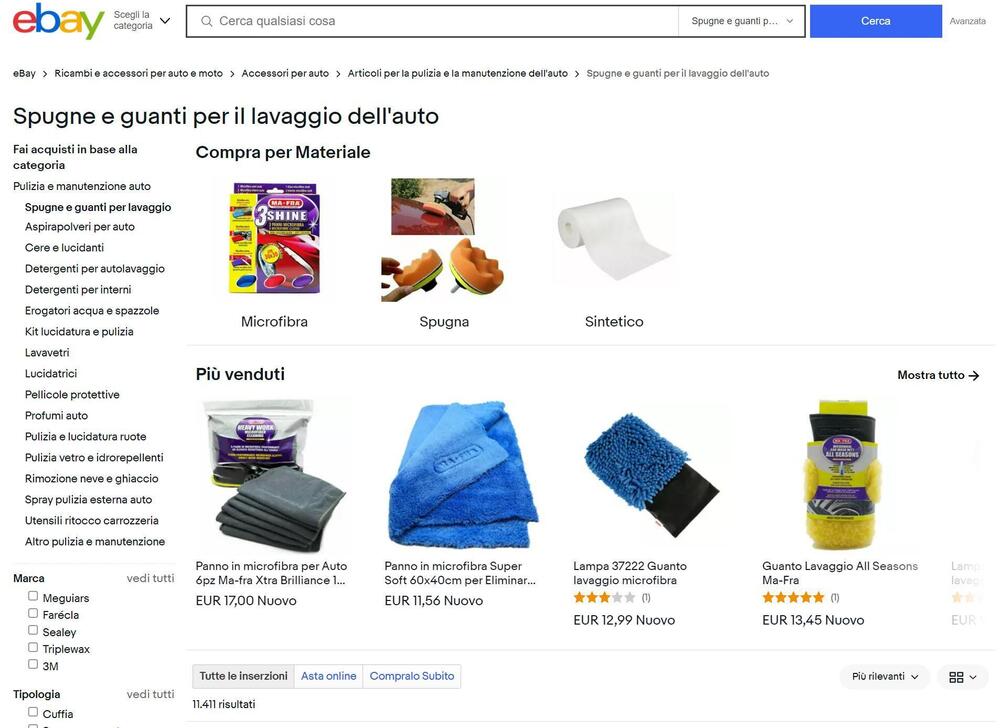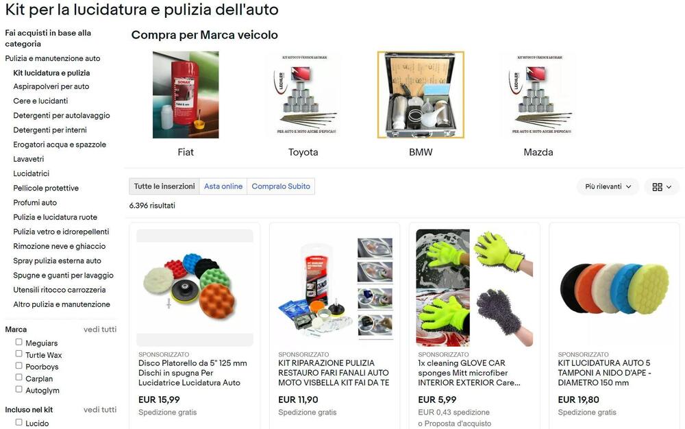 Proprio per le spugne o i guanti (spugna, microfibra o sintetici) eBay offre infinite scelte di prodotti singoli o in Kit, di ogni gusto e prezzo. Diverso è il discorso dei prodotti detergenti. Qui si possono trovare, usando i vari filtri nelle sezioni dedicate del marketplace, prodotti low-cost generici adatti a ogni genere di auto, o di elevata qualità che “coccolano” ogni superficie in modo specifico. Come ad esempio i detergenti più moderni ad azione delicata e duratura, piuttosto che quelli sgrassanti e concentrati. Prodotti venduti su eBay da rivenditori di marchi per professionisti, Anche questi filtrabili con le funzioni di ricerca del marketplace.
