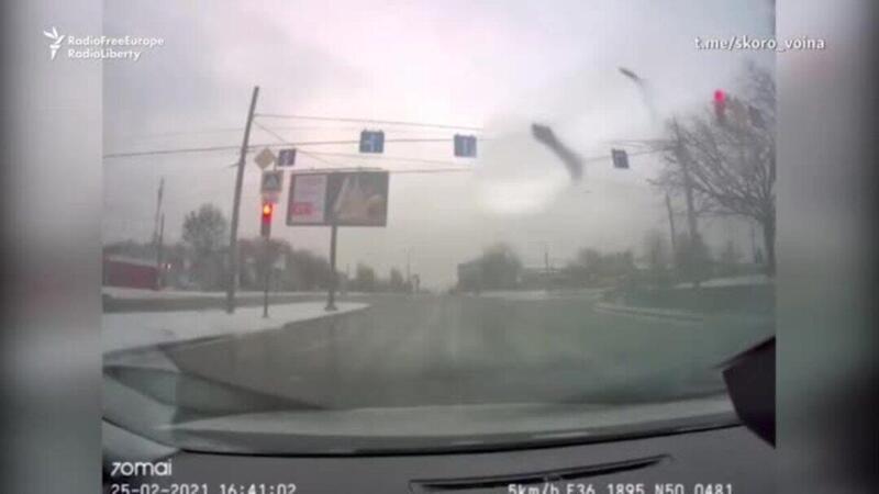La camera car dall’abitacolo di una vettura mostra come il conducente si sia trovato a guidare evitando esplosioni sulla sua strada, in quel di Kharkiv, zona di scontro tra le forze di Russia e Ucraina.
