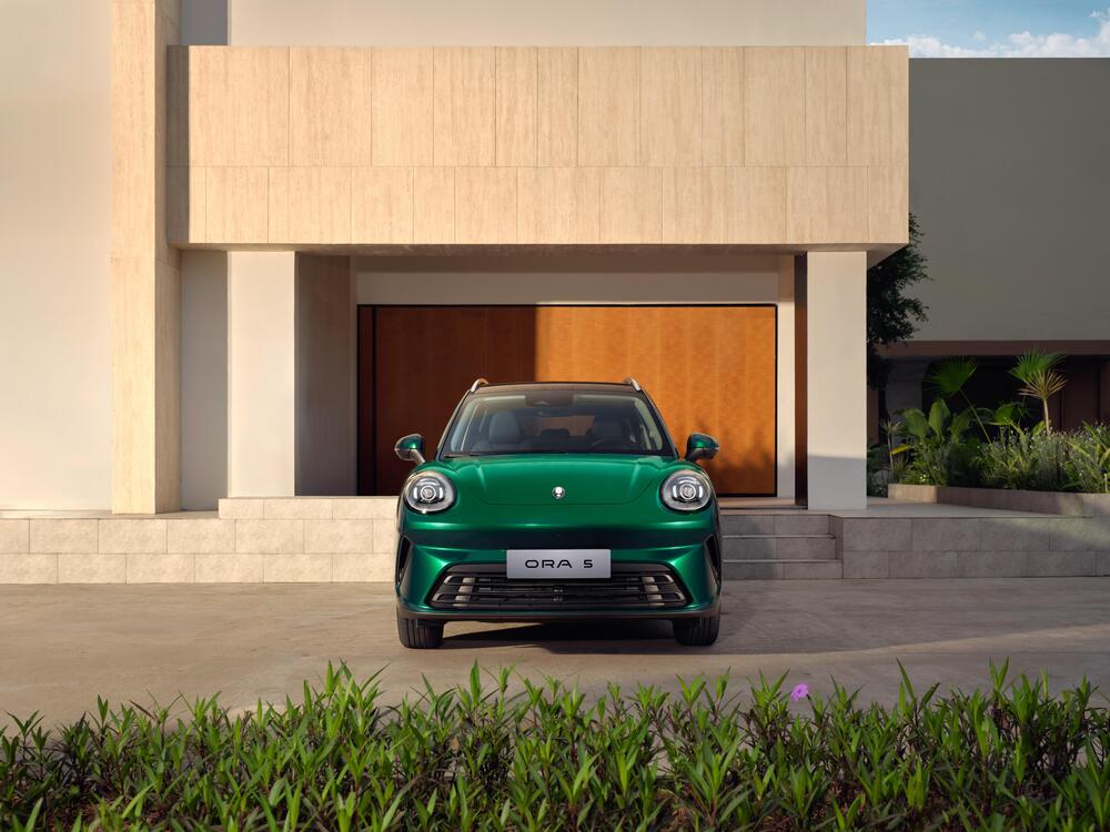 Uno degli elementi più distintivi della ORA 5 è il design, sviluppato secondo il linguaggio stilistico denominato “Full-Surface Fluid Sculpture”. Le superfici morbide e continue richiamano elementi naturali come acqua e nuvole, creando un effetto dinamico che punta a differenziarsi dalle linee più aggressive tipiche del segmento. Il frontale è caratterizzato da fari LED a forma di goccia ispirati alla tensione superficiale dell’acqua, mentre le linee della carrozzeria convergono verso il posteriore generando un effetto visivo fluido e aerodinamico.