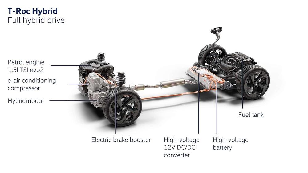 Passando al mondo delle motorizzazioni ibride, negli scorsi mesi abbiamo conosciuto la nuova generazione della Volkswagen T-Roc, evoluta ulteriormente nelle dimensioni e dal punto di vista tecnico e tecnologico. Quest'anno segnerà il debutto, proprio su questo modello, del primo powertrain full hybrid nella storia di Volkswagen.