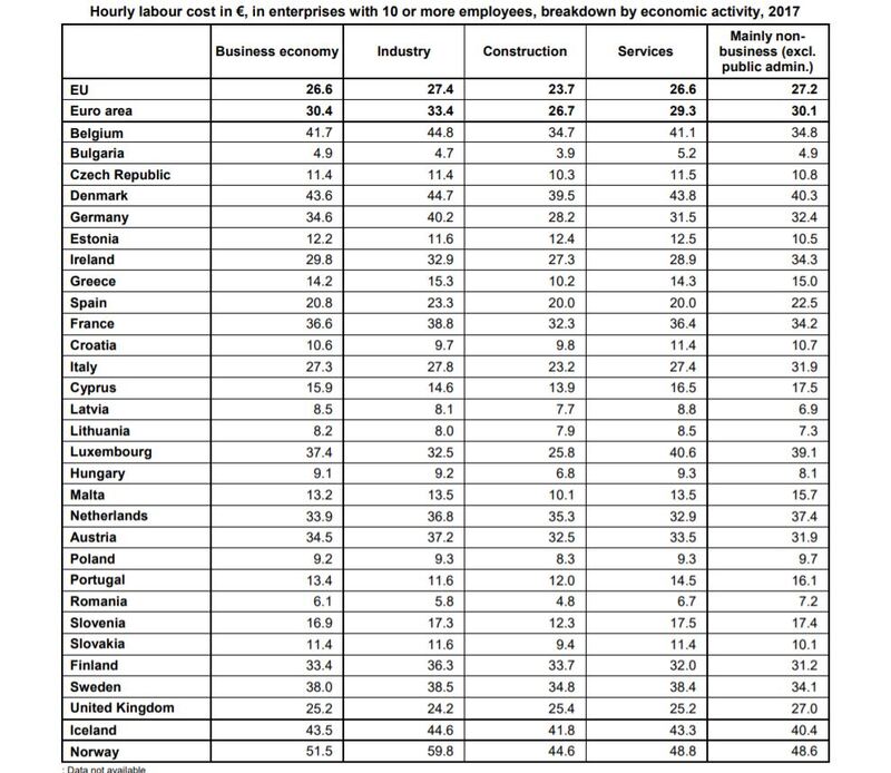Sono stati divulgati i valori medi ufficiali del costo orario di manodopera a livello europeo, nello specifico € 26.8 per l’Unione (EU) e € 30.3 per l’area euro. Il Bel Paese è pienamente nella media, con il valore di 28,2 €, mentre il costo più elevato è quello danese, con ben 42,5 euro. Il trend generale non vede scossoni rispetto agli anni recenti, ma gli estremi sono davvero distanti, pensando che si parla sempre di Europa, in rapporto superiore alle otto volte addirittura, riferendosi ai picchi del nord (Danimarca, Belgio, Lussemburgo e Svezia). Alcune nazioni come Bulgaria, Romania e Lituania, ma persino Polonia e Ungheria, stanno infatti ben sotto i dieci euro orari di costo.