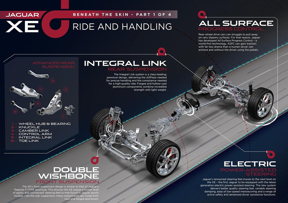 Per la sospensione anteriore, la Jaguar XE riprende la filosofia progettuale della F-Type «sarà ancora migliore della XFR - ha sentenziato Mike Cross - in termini di stabilità e rigidità».