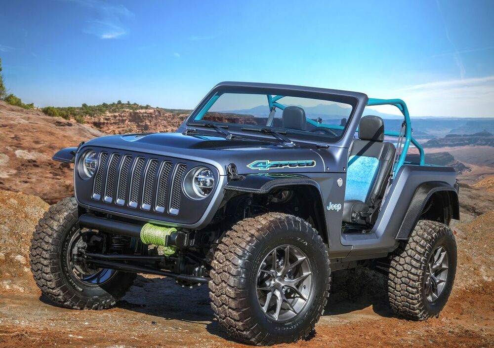 La Jeep4SPEED è una interpretazione della nuova Wrangler che poggia su enormi ruote da 35” che è stata alleggerita adottando un cofano e un vano di carico in fibra di carbonio, un parabrezza piccolo che imita le vetture “speedster” e sbalzi ridotti. Il concetto alla base è quello della riduzione del peso. Il motore è il 2 litri 4 cilindri in linea di recente introduzione.