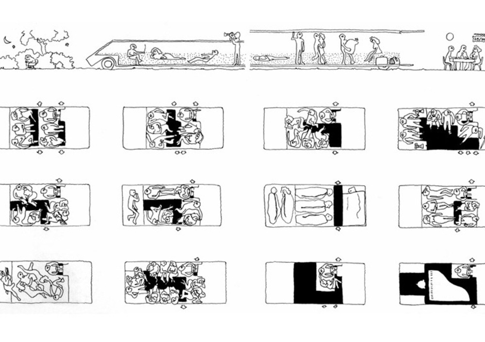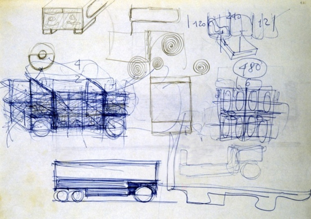 L’opera d’arte è lunga più di sei metri e al proprio interno, oltre al volante, si presenta come uno spazio modulabile attrezzato con cuscini che possono essere disposti in base al numero di occupanti e alla funzione assunta dal mezzo che, come si evince dai bozzetti, era stato pensato per cavalcare il movimento Hippy, che aveva visto il proprio culmine solo pochi anni addietro.